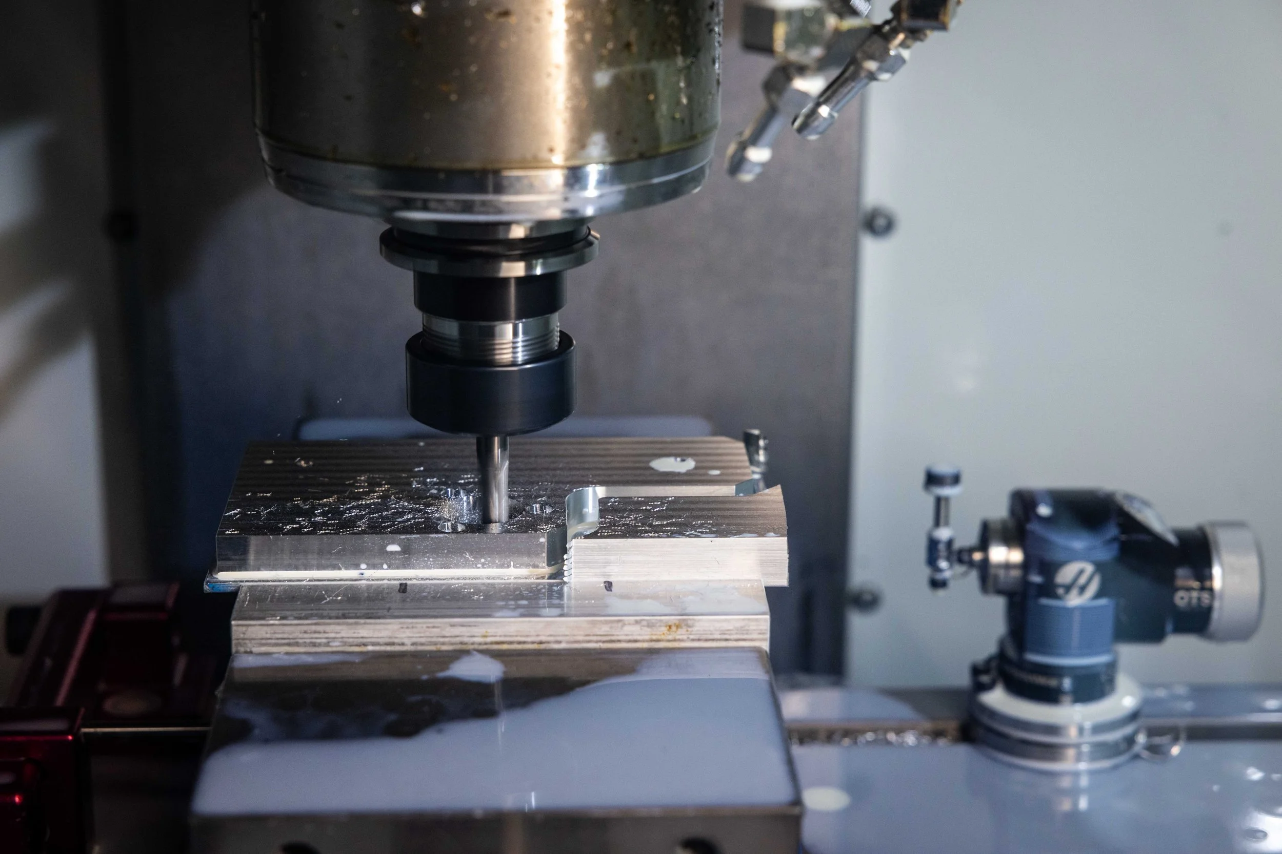 Precision CNC machine working on a metal piece in a manufacturing setting.