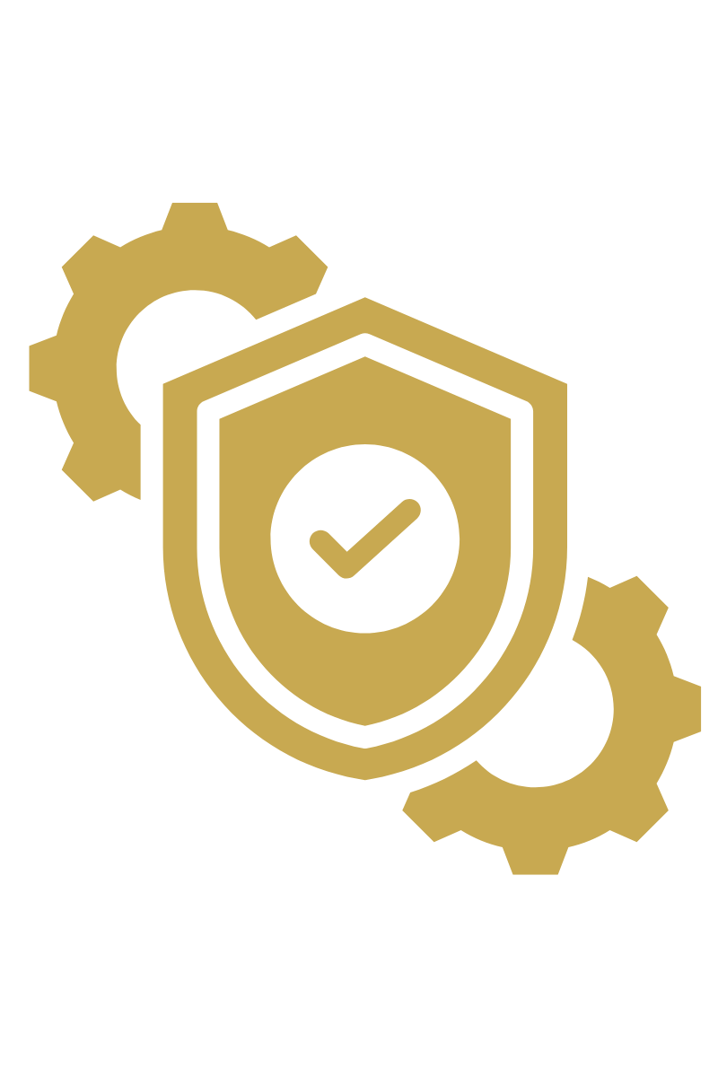 A shield with a checkmark in the center, flanked by two gears, symbolizing security and system protection.