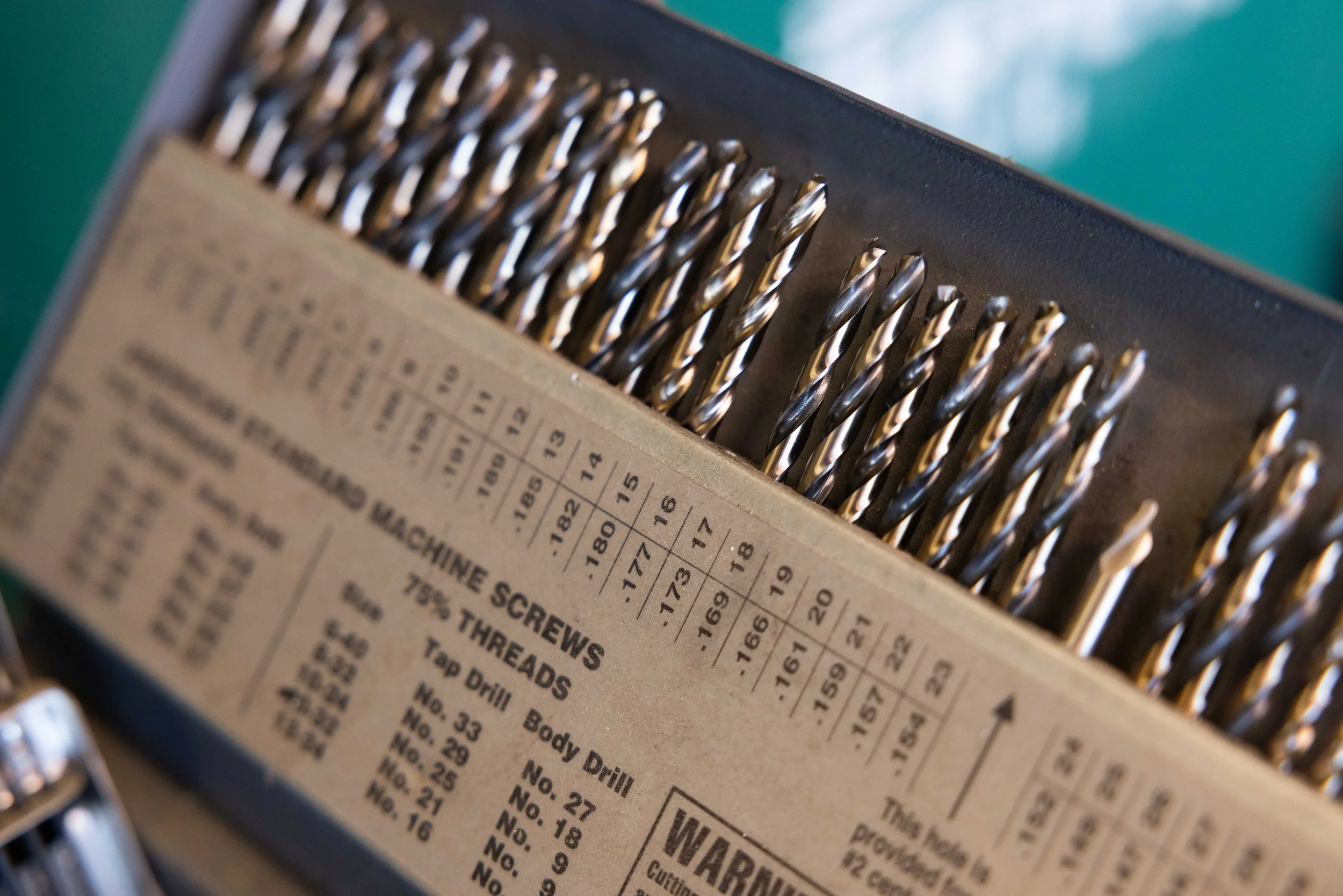 Close-up of a box containing various drill bits and a printed chart listing screw and thread sizes.